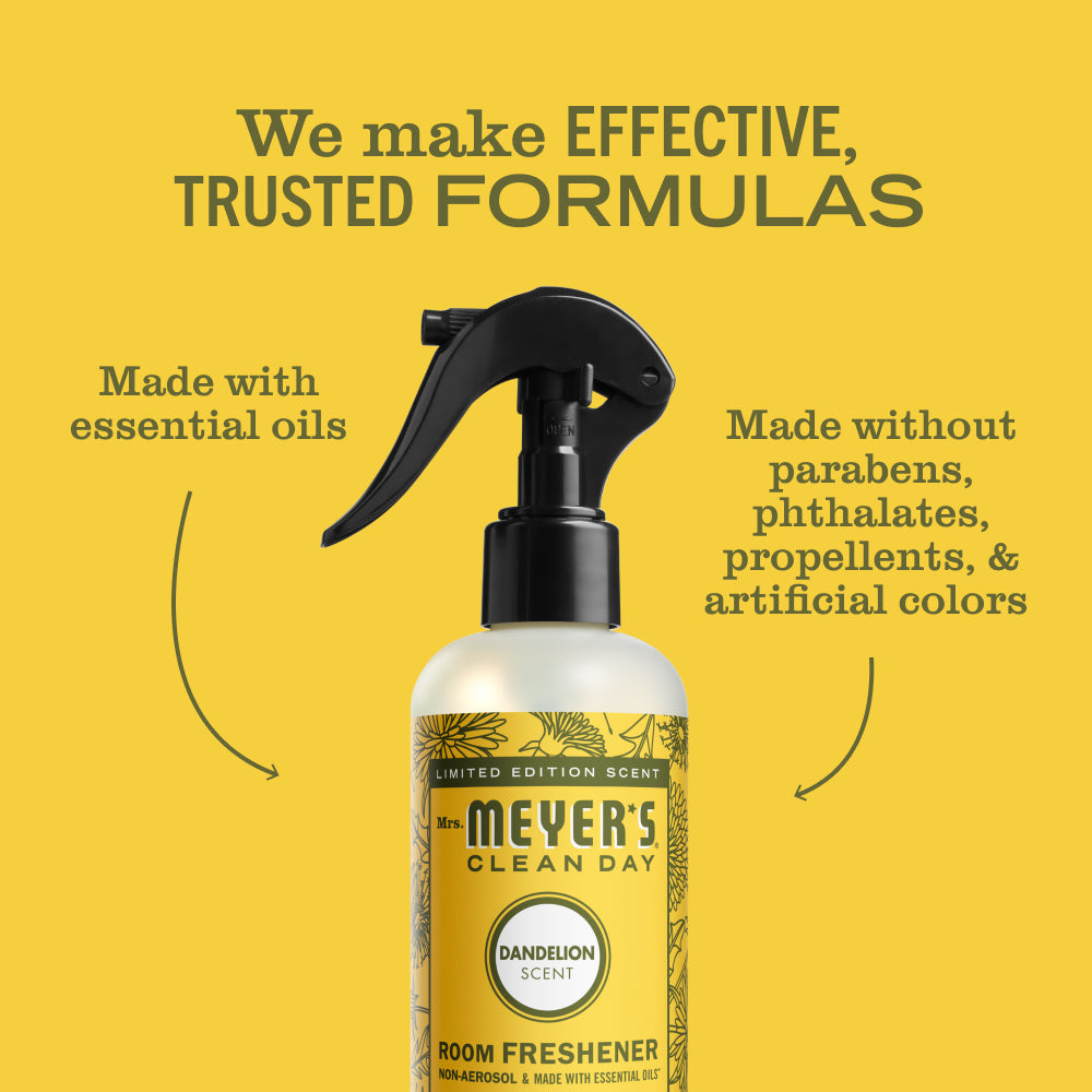 - Mrs. Meyer’s Clean Day Dandelion air freshener spray is made with essential oils and other thoughtfully chosen ingredients. and gives your home instant freshening between cleaning days