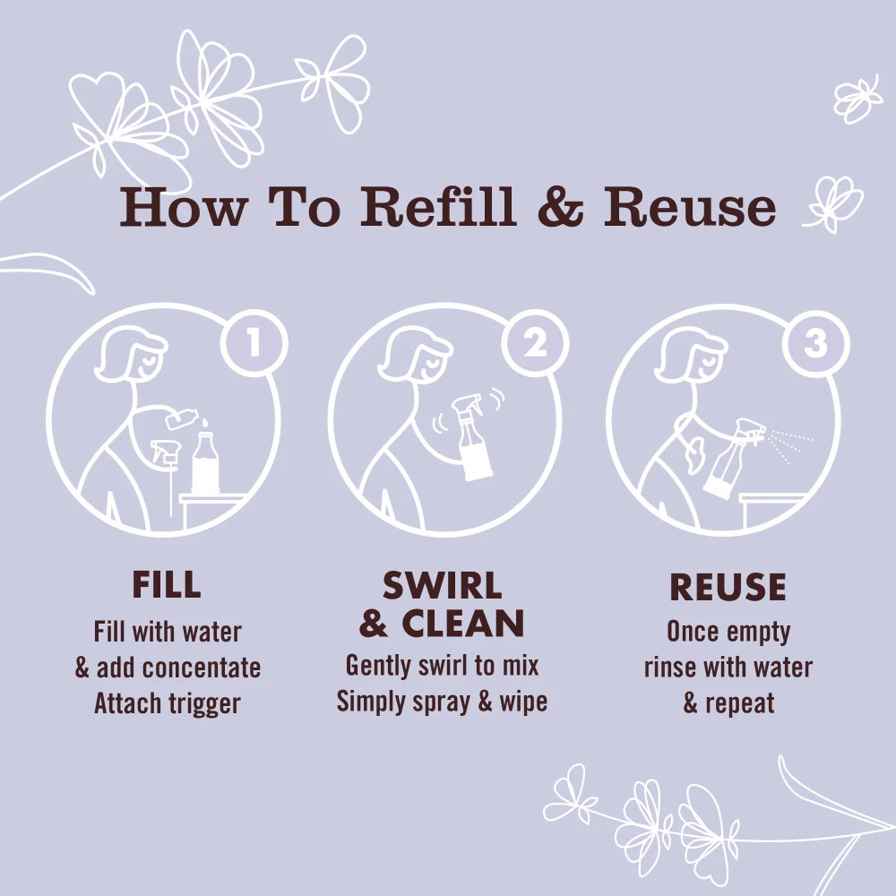 • This concentrated refill can be used to refill the glass bottle or our single use Multi-Surface Everyday Cleaner bottles
